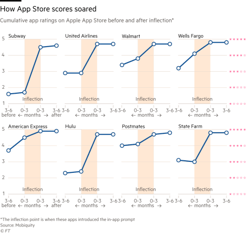 从某种意义上说,这是一个巨大的成功。用户评分的参与度飙升。根据Apptentive的数据,平均每个应用程序的评分从2017年的1.9万次上升到2019年的逾10万次。相比之下,谷歌应用商店在这段时间内并未提供应用内评分,单个应用的评分仅从3.3万次上升到4.3万次。