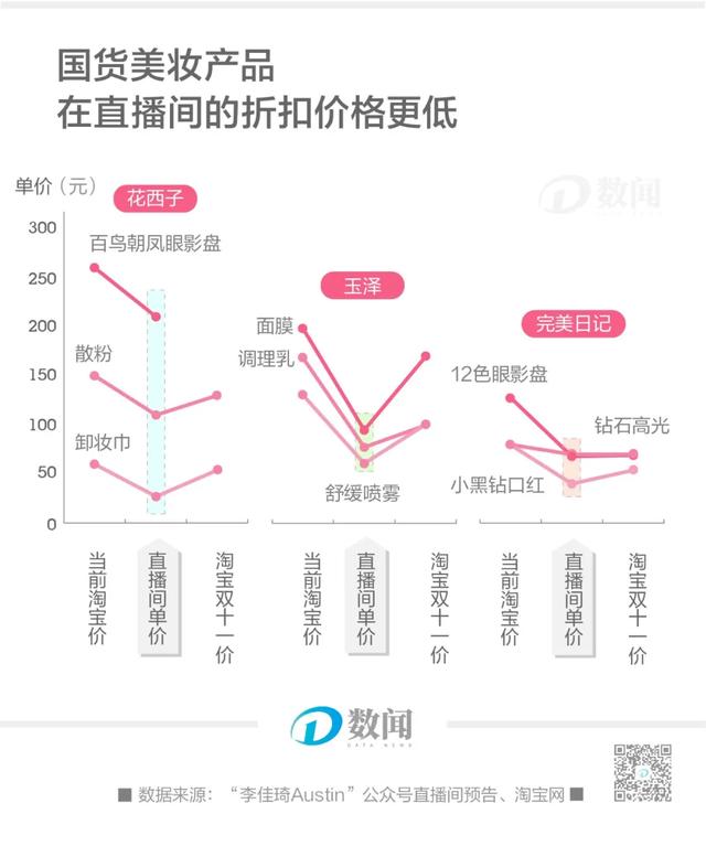 直播间的巨大流量,让许多国货品牌一再让利。数闻DataNews的一篇分析文章显示,完美日记、玉泽、花西子三个品牌热门单品的直播价格均低于双十一。