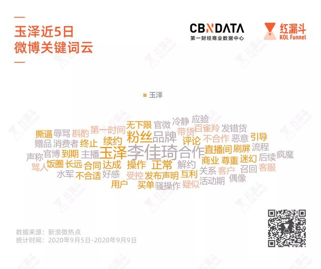截至9月9日,微博#玉泽#话题阅读量超300万,提及最多的词语是“李佳琦”,围绕着李佳琦的高频词语还有“合作”、“解约”、“粉丝”。另一些被网友反复提及的是“迷幻”、“疯魔”、“骚操作”等形容词。