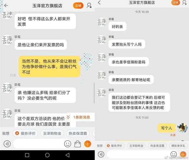争议之下,个别粉丝前往玉泽旗舰店要求客服开发票,客服却反问“是李佳琦叫你们来的吗”,把这一纠纷事件热度推高。