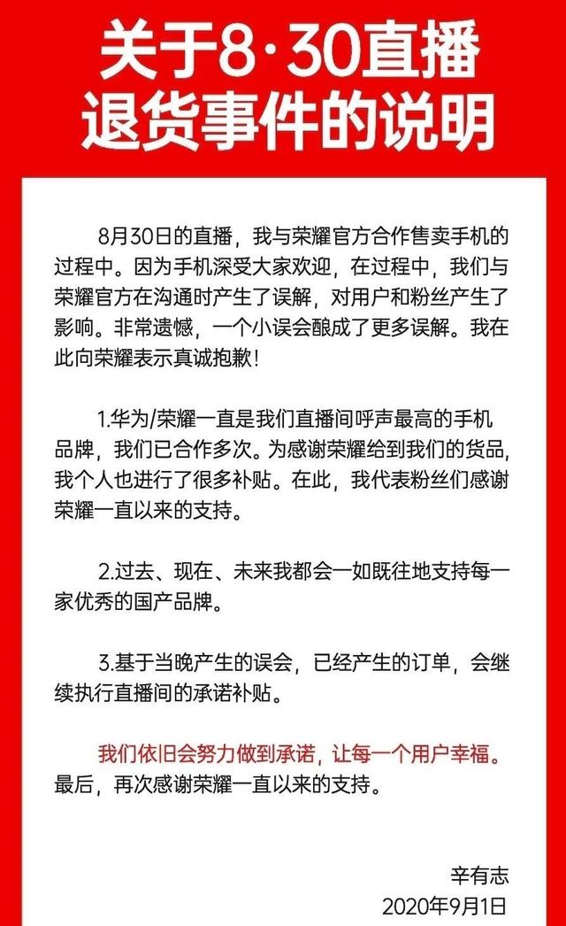 近日快手头部主播辛巴带货华为旗下一款荣耀手机时,表示将自掏腰包为每部手机补贴300元,后又要求品牌方为每部手机赠送一副耳机,遭到品牌拒绝。辛巴喊话“4000万交不下华为这个朋友,我不交了”,随后在粉丝群中号召粉丝集体退货。最后,该事件以辛巴道歉告终。