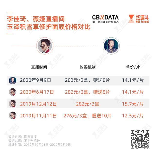 CBNData消费站盘点近一年的部分大促活动发现,单从价格来看,玉泽一款爆款单品面膜,在李佳琦618直播间和薇娅9月9日直播间的价格一致,并不存在“让利讨好薇娅”一说。