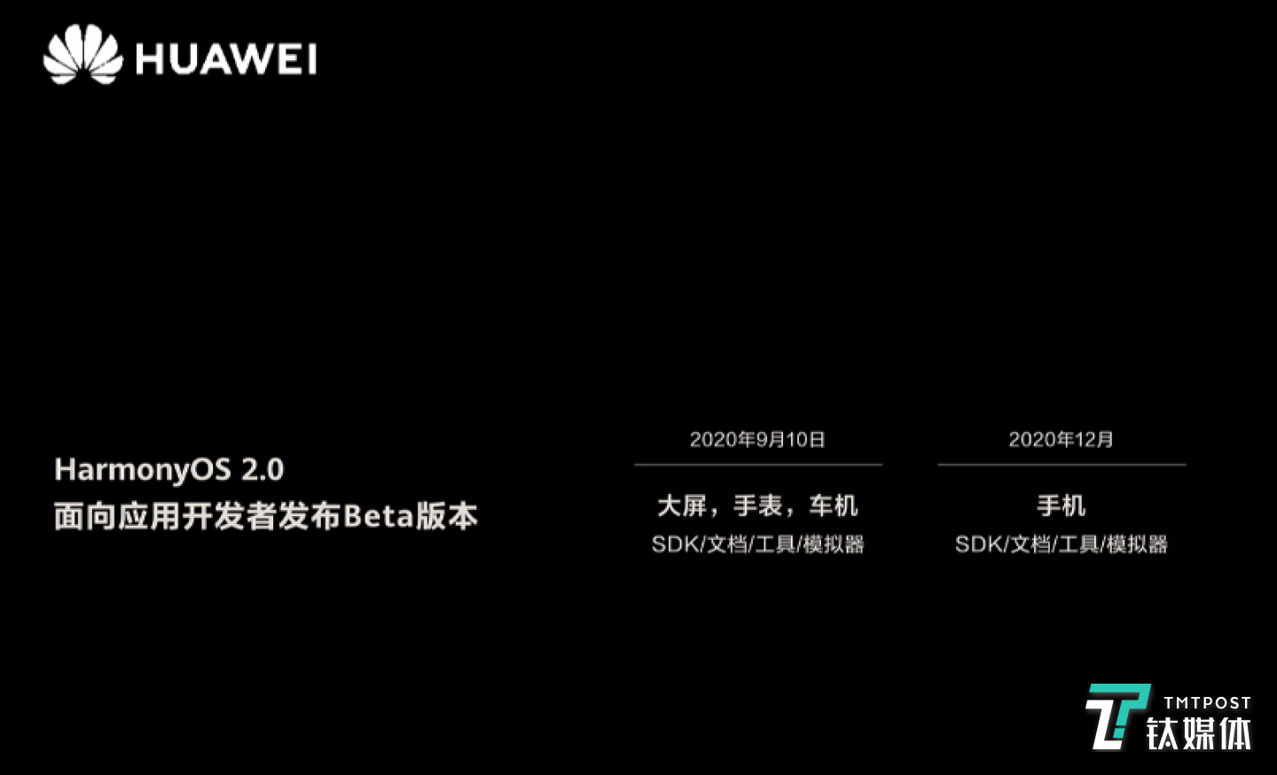 HarmonyOS将正式开源,开发者将获得模拟器、SDK包以及IDE工具,2020年底首先对国内开发者发布针对智能手机的HarmonyOS beta版本。