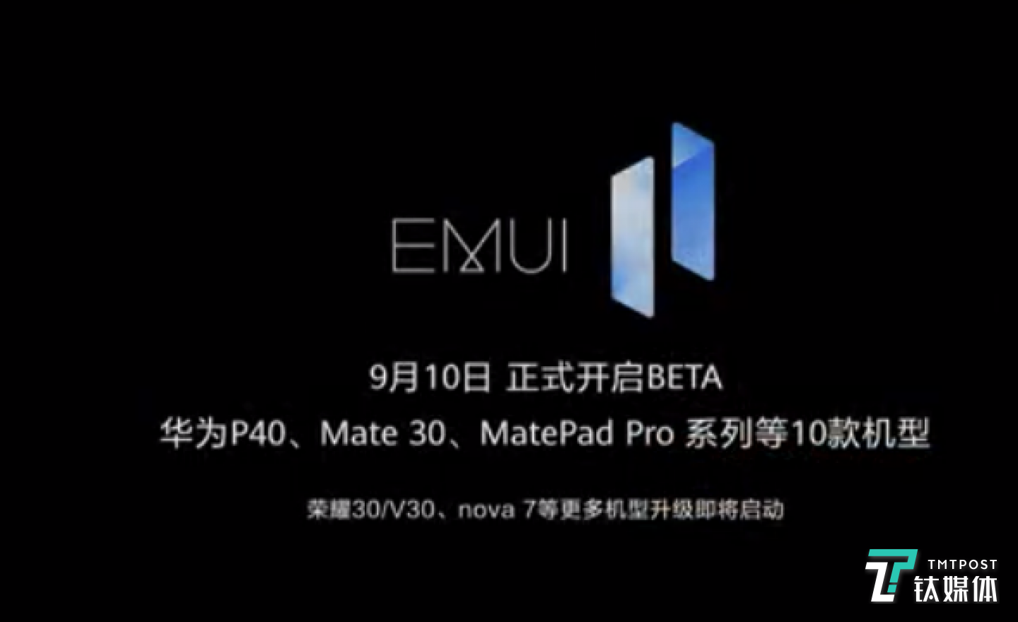 9月10日起,华为将正式面向P40、Mate 30、MatePad Pro系列等10款机型推送Beta版本EMUI 11系统,随后,荣耀30/V30、Nova 7等更多机型升级即将启动。