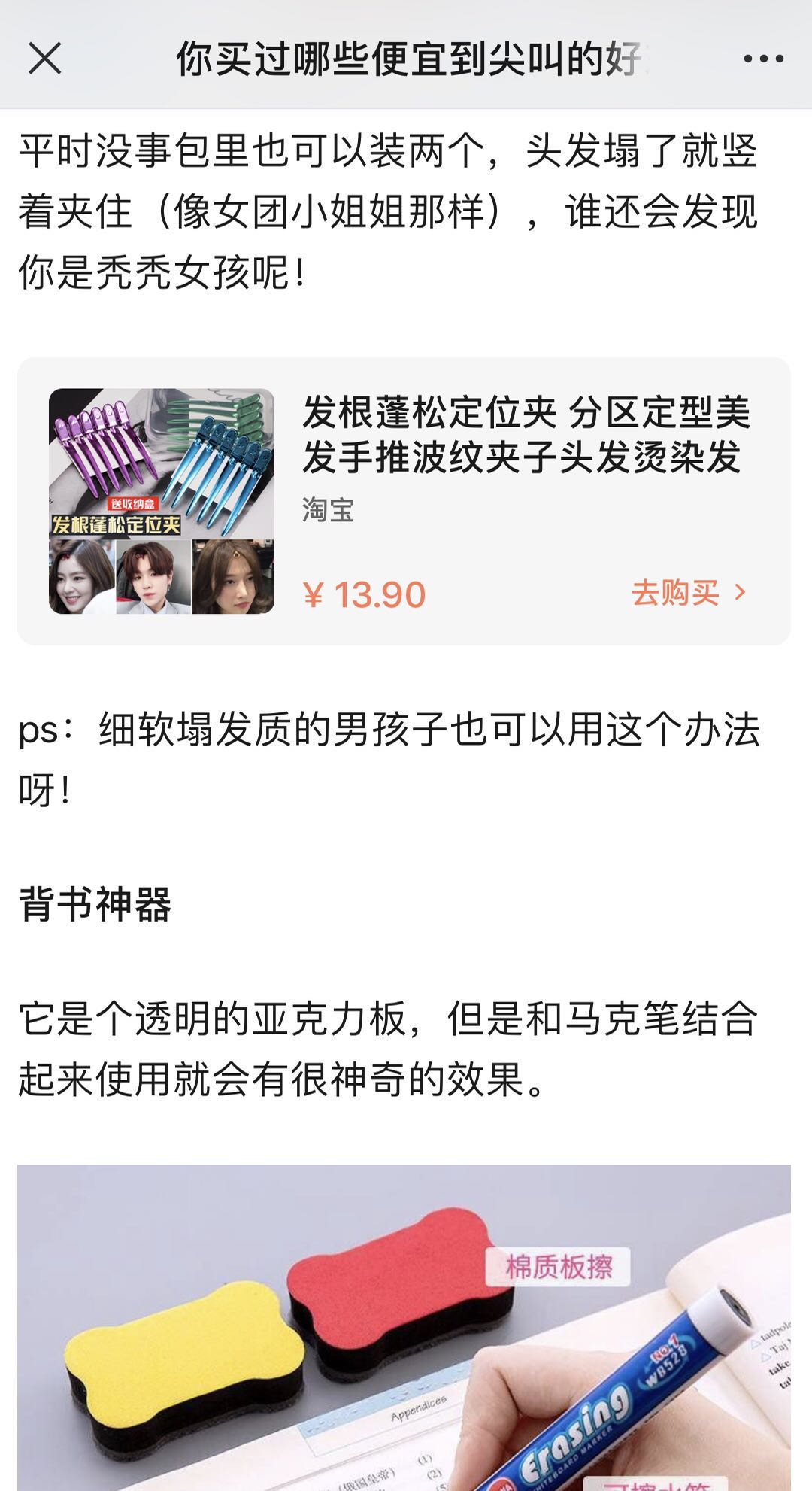 也就是说,即便什么领域都不擅长的学员,也都可以通过“讲故事”推荐商品。他往群里转发了几篇用户文章,讲的大多是职场、生活、租房、购物中的有趣故事,可以看到文章中同样插入了一些商品链接。