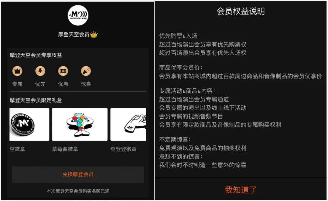 以本次会员专属五条人演出为首,摩登天空会员权益包括专属、优先、优惠和惊喜四大分类,将为用户提供优先购票权、优先入场权、商品会员价、专属活动、商品、内容,以及免费观演和抽奖权利。