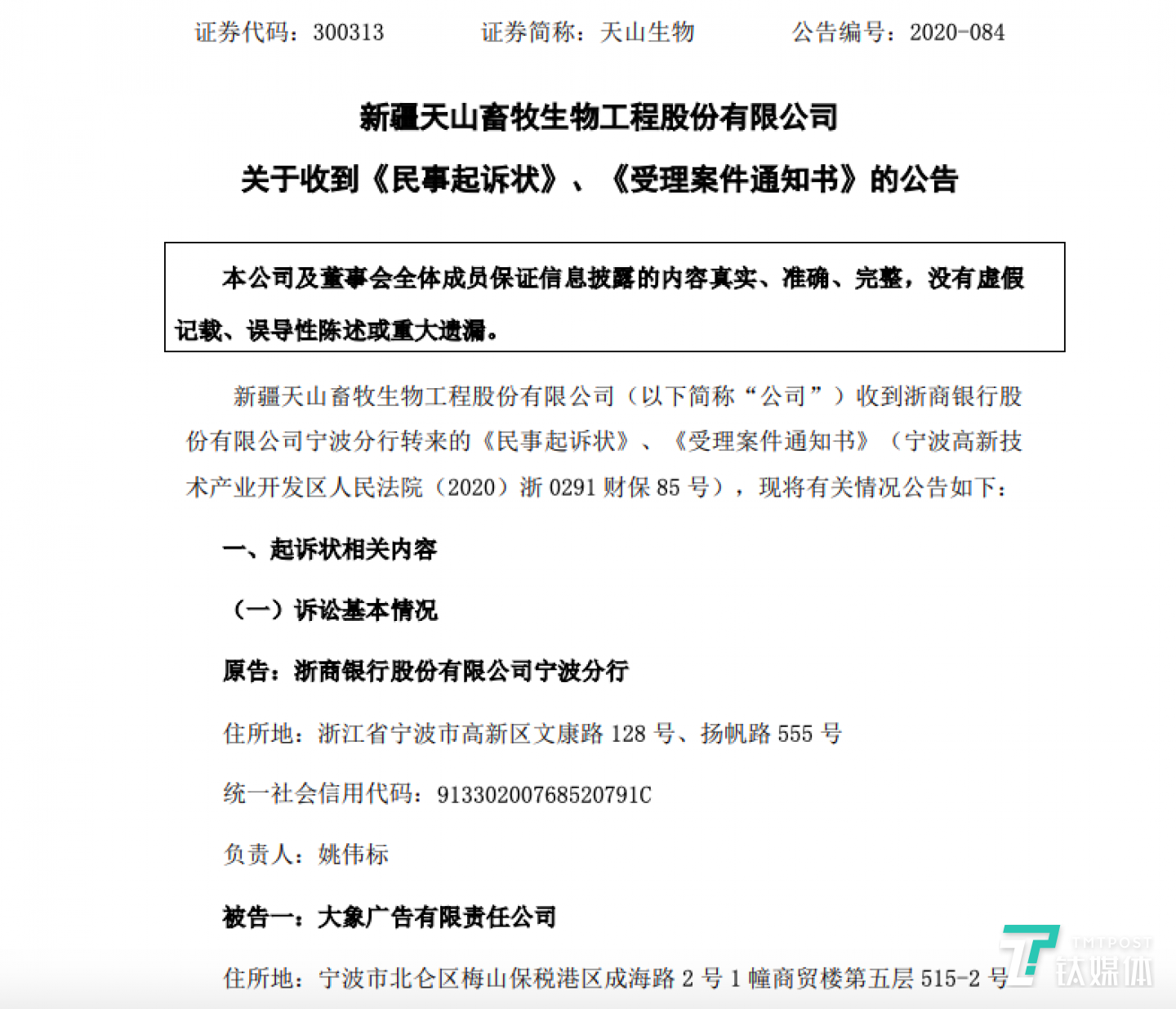 《民事起诉状》显示,2019年11月13日,天山生物曾与浙商银行宁波分行签订《最高额保证合同》,约定自愿为大象广告在6496.60万元的最高余额内的有关债务提供担保。由此,此次天山生物被列为被告。