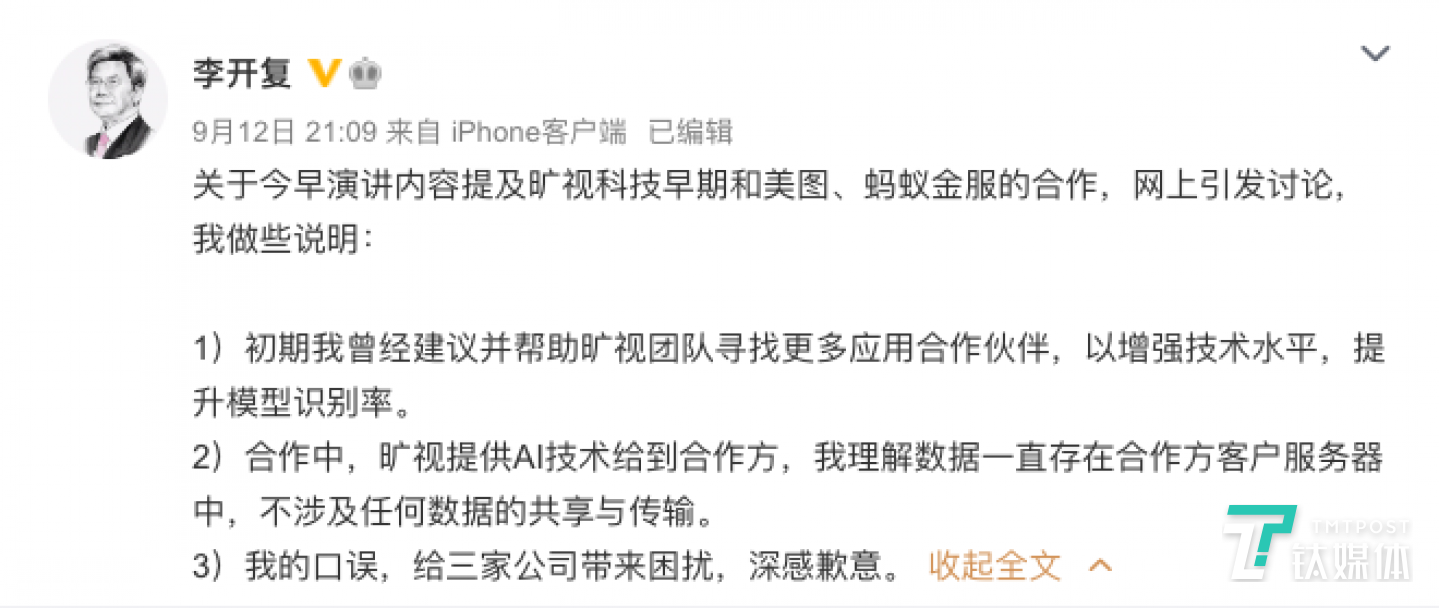 李开复也发文致歉,李开复表示,关于今早演讲内容提及旷视科技早期和美图、蚂蚁金服的合作,网上引发讨论,对此做些说明: