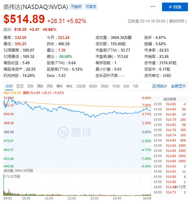 在英伟达大手笔拿出礼金背后,今年英伟达在业绩跟股价这两个层面都向投资者交出了较好的成绩单。受收购消息刺激,9月14日英伟达盘前一度涨超6%。截至目前,英伟达盘后股价为518.30美元,市值为3176.87亿美元。