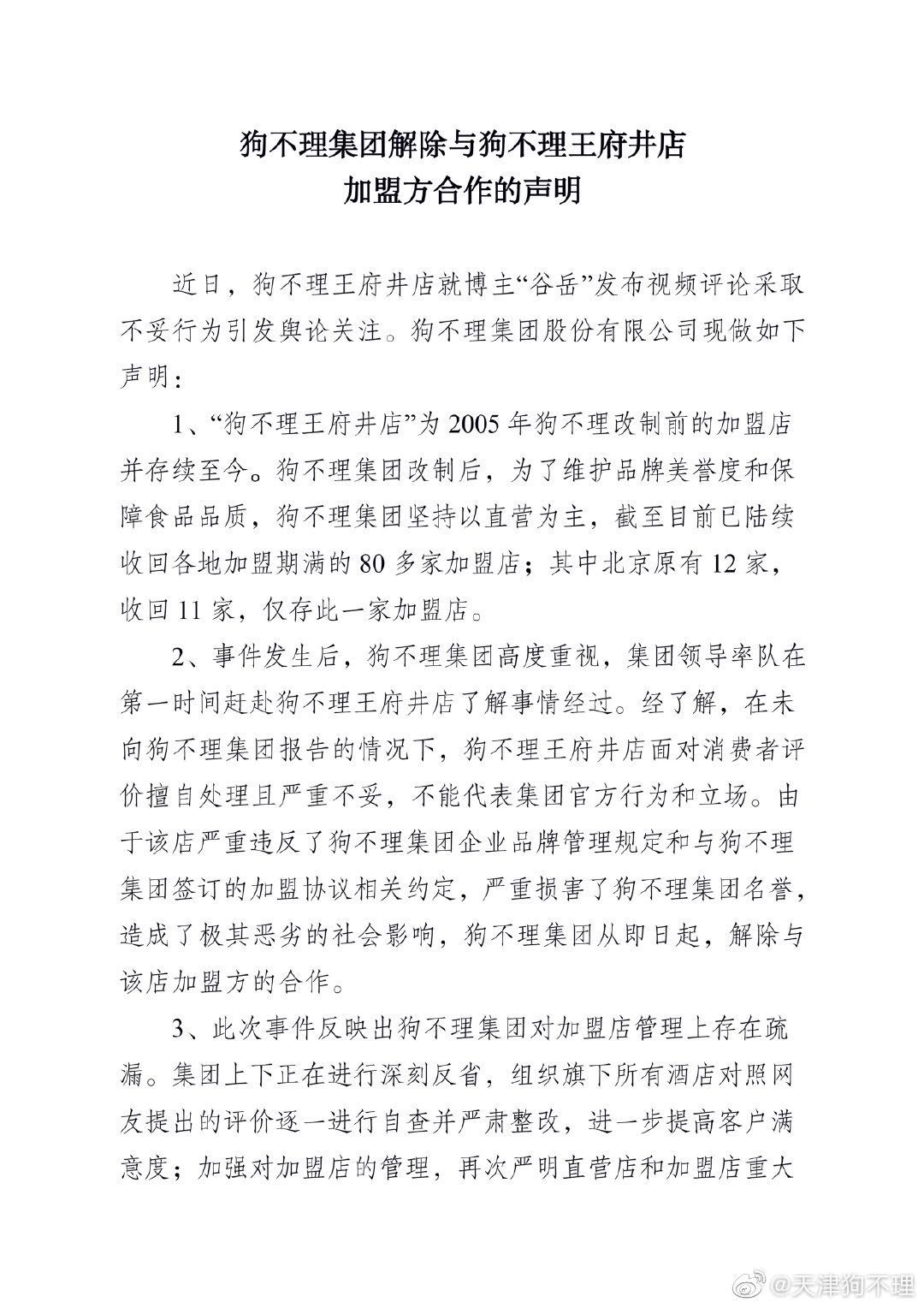 以下是狗不理集团解除王府井店声明全文: