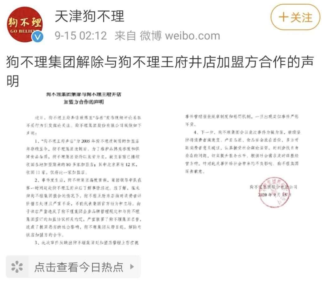 今日,狗不理集团官方发布声明称,事件发生后集团高度重视、深刻反省、严肃整改;王府井店为加盟店,现已解除合作;针对此次事件给社会带来的不良影响,狗不理集团深表歉意。