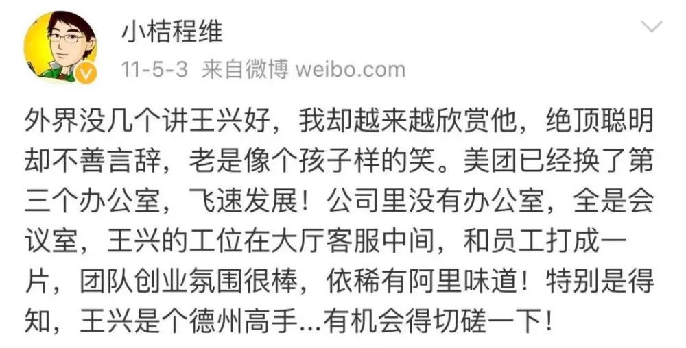 有意思的是程维不止一次公开表达过对美团CEO王兴的赞赏。他评价王兴“绝顶聪明却不善言辞”,说王兴创业早期“团队创业氛围很棒,依稀有阿里味道”。滴滴打车App刚做出来时,他还跑去请教王兴,得到“很垃圾”的反馈后改善了产品体验。