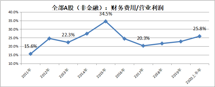 从A股上市公司数据看,2015年的融资成本负担最重,财务费用占到营业利润的34.5%,之后呈现下降趋势,最低降至2017年的20.3%,之后受经济增长影响,企业盈利能力继续萎缩,财务费用占比开始回升,今年上半年为25.8%。
