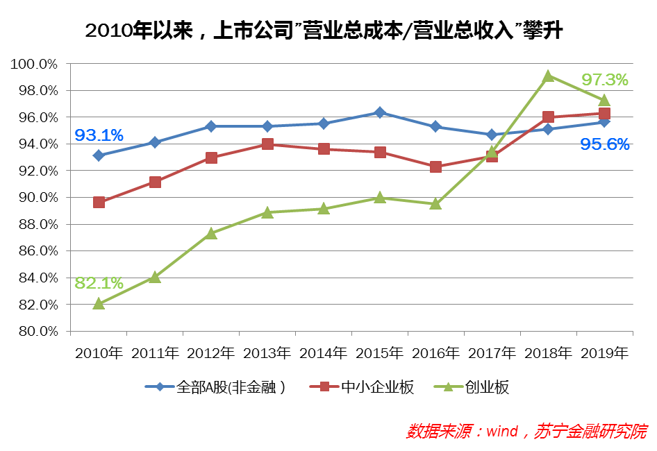就我国情况看,一边是产能过剩,一边是经营成本攀升。从上市公司数据看,2010年以来,全部A股非金融上市公司营业总成本/营业总收入从93.1%提升至95.6%;而中小板、创业板企业更为明显,创业板上市公司成本比从82.1%升至97.3%,侵蚀盈利能力、压制投资意愿。