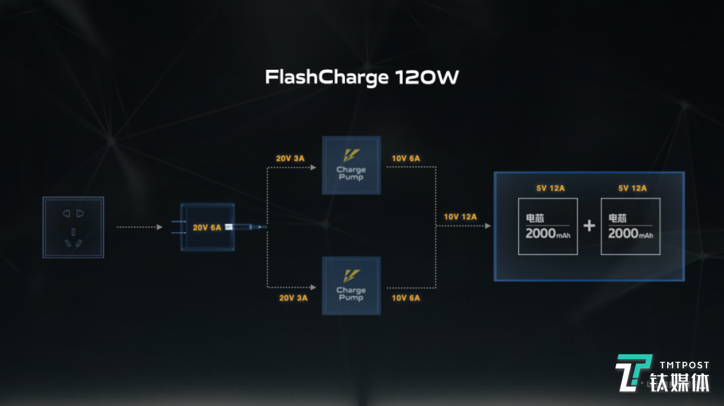 iQOO 5 Pro内置了4000毫安电池,实际上是有内部两块2000毫安电池出串联而来。通过iQOO自家定制充电转化率高达98.5%的行业最高水准电荷泵芯片,完成20V/6A到10V/12A的电压电流转换,再将传统的单电池升级为业内首发量产的6C高倍率双电芯电池组,引入创新“阵列式极耳结构”,通过串联降压的原理将10V/12A最终转化为(5V/12A)×2,最终实现15分钟充至100%,并在整个过程中完成了多项业内突破。