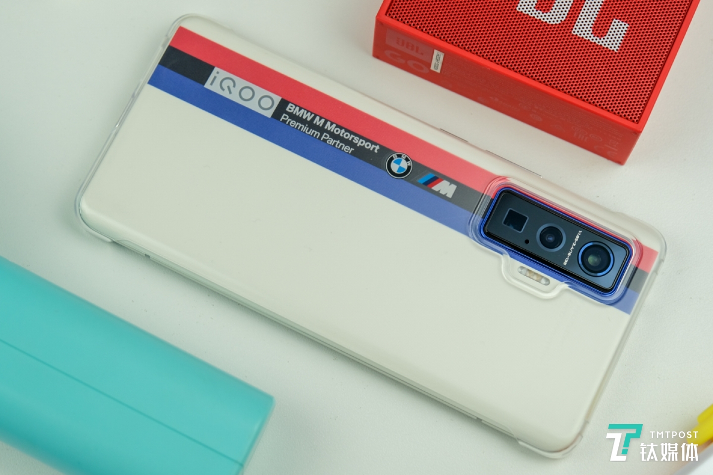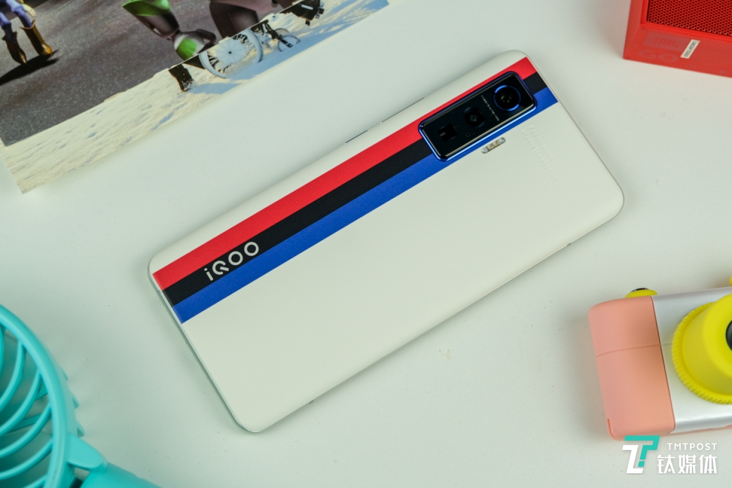 钛媒体这次拿到的是iQOO 5 Pro 传奇版,iQOO与BMW M Motorsport成为全球顶级合作伙伴,将赛道还原在手机背盖,结合BMW M赛车经典配色。背盖主体白色素皮的纹路模仿路面质感,三色条纹如赛道一般贯穿整体,整体质感和色彩突出了宝马的动感与激情,体现iQOO系列对速度感与质感的追求。