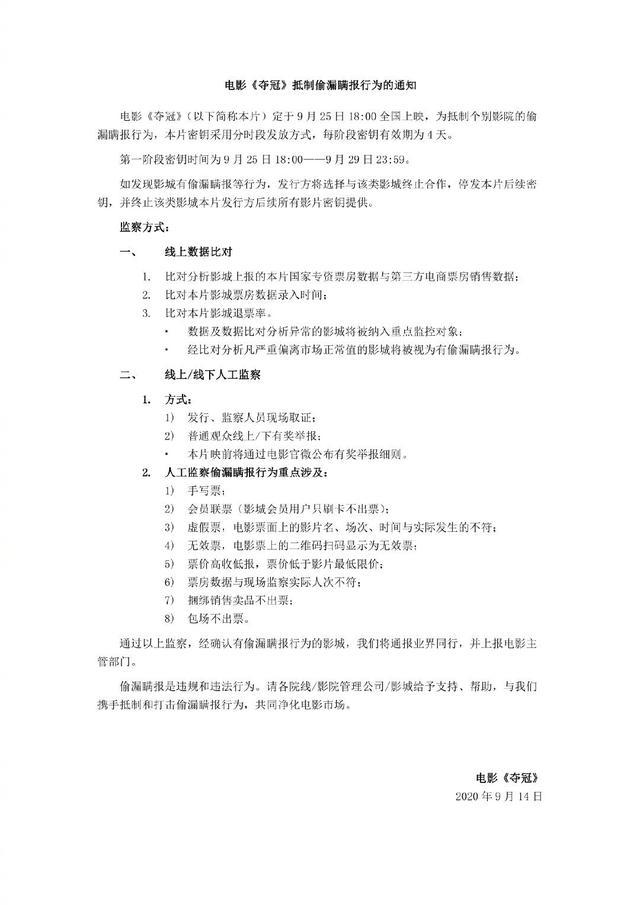 在此之前,《八佰》也曾采取间歇性密钥的类似策略:发行方华影天下在采访中表示“将11800家影院进行降序排列,将专资办数据和两个票务平台的数据进行比对,判断产出是否正常”,在官方声明中指出,未获得《八佰》放映密钥的影院主要为被行业协会公开处理过的存在偷漏瞒报等违规行为的部分影院。另外,还联合发行方、第三方监察平台组成700多人的线下监察团队,主要针对三四五线城市及重点地区。