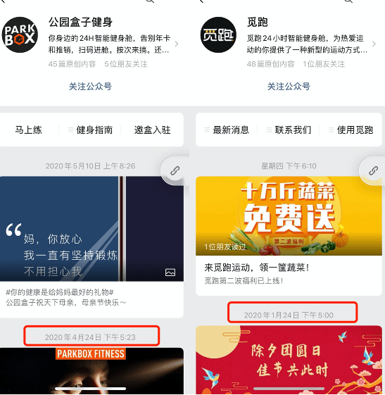 对外,共 享健身仓已经集体沉默,头部玩家觅跑和公园盒子两家的官微不仅发的内容无关痛痒,两条微博甚至可以时隔三个月甚至是大半年,几乎处于无人运营状态,而营销端更是全面沉寂。