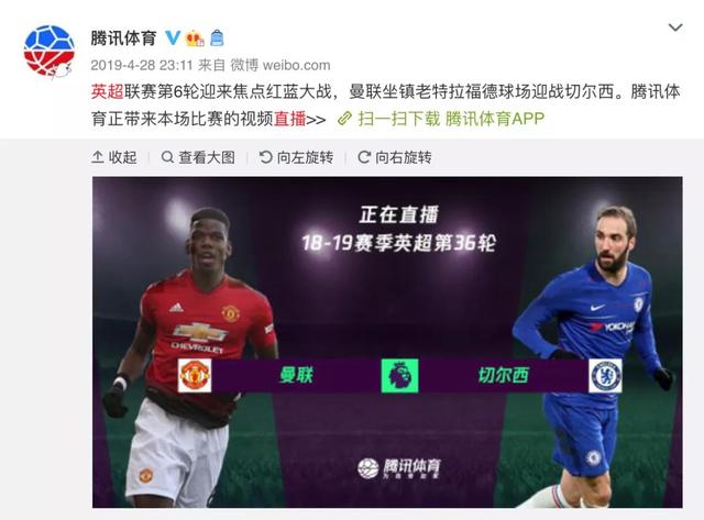 2019年4月28日,腾讯体育一条关于英超直播的微博