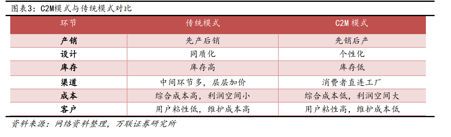 万联证券研报指出,与传统的“先产后销”模式和网络电商模式相比,C2M模式能够去掉库存、物流、总销、分销等中间环节,避免层层加价,可以让价格更加透明,消费者和厂家都从中获益,能够满足消费者个性化和追求性价比的消费需求。最重要的是,C2M模式契合了下沉市场消费者对价格较为敏感的特点,能够助力电商企业开发下沉市场。