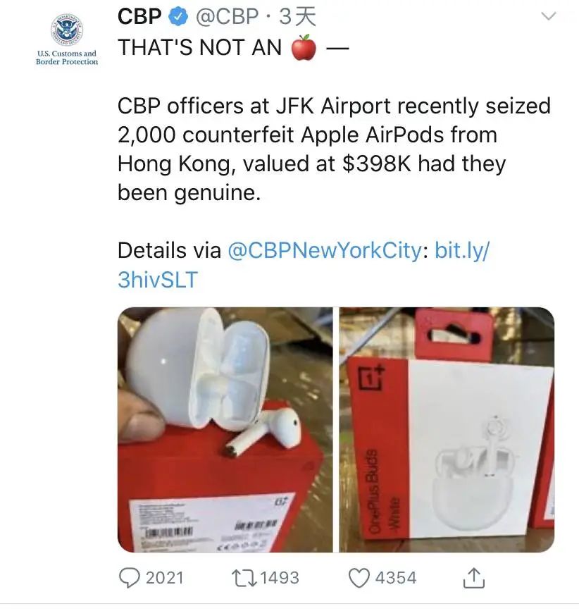 8 月底,美国海关和边境保护局(CBP)称截获了 2000 个盗版 AirPods 。以正品价格计算的话,这批耳机价值达 398000 美元(约合人民币 2717902 元)。