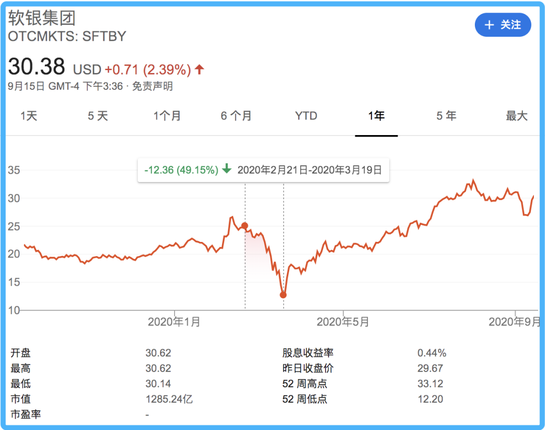 由于旗下愿景基金投资WeWork和Uber等项目巨亏,软银股价自今年2月21日起开始暴跌,到3月19日股价几近腰斩,跌幅达49.15%,创20年来最大跌幅。