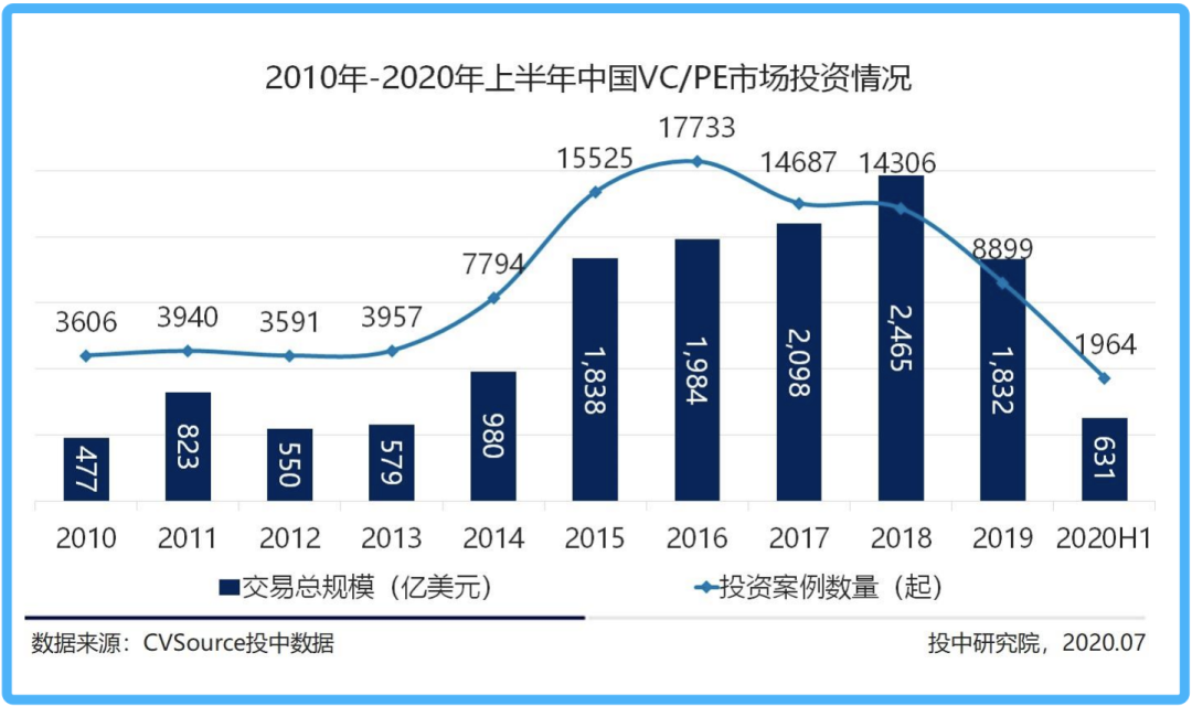 2020年上半年,整个中国VC/PE市场投资数量仅1964起,不及上年度全年投资案例的四分之一,而2019年的投资数已较2018年下滑了37.8%。
