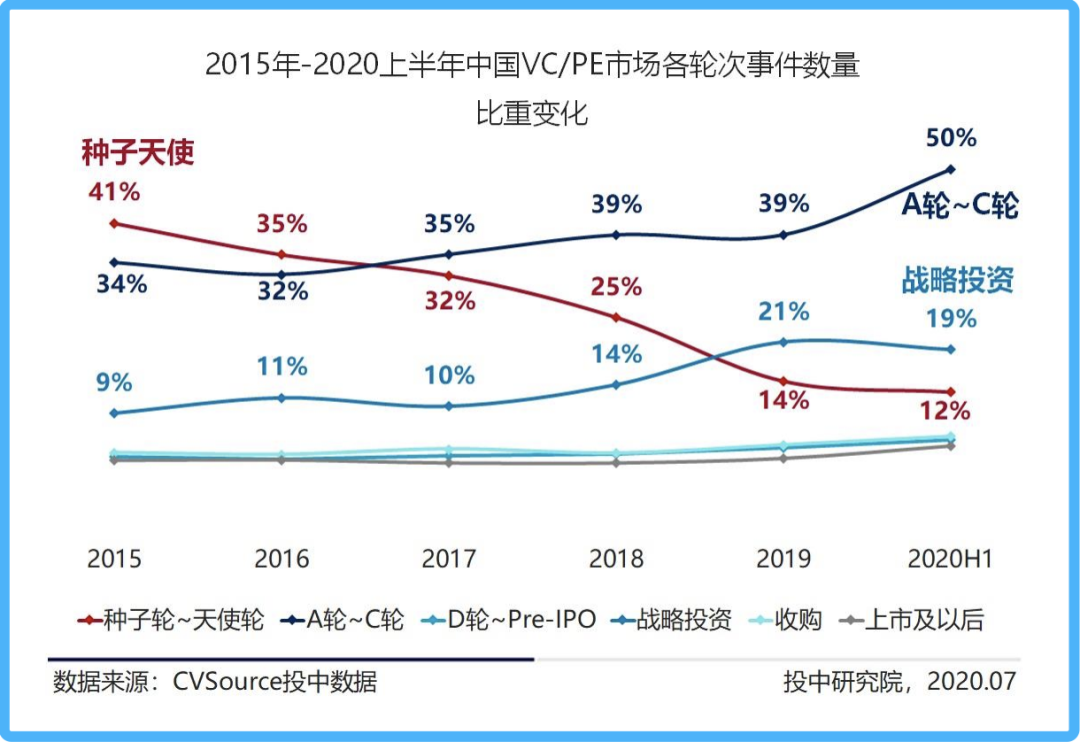 根据上述《报告》,自2015年起,VC/PE机构种子轮和天使轮投资数量占比明显下滑,特别是到了2019年,占年投资事件总数只有14%;相比之下,A轮-C轮投资整体呈上升态势,2020年上半年占比已达50%;而收购、上市及以后阶段投资事件占比曲线斜率较此前也在扩大。