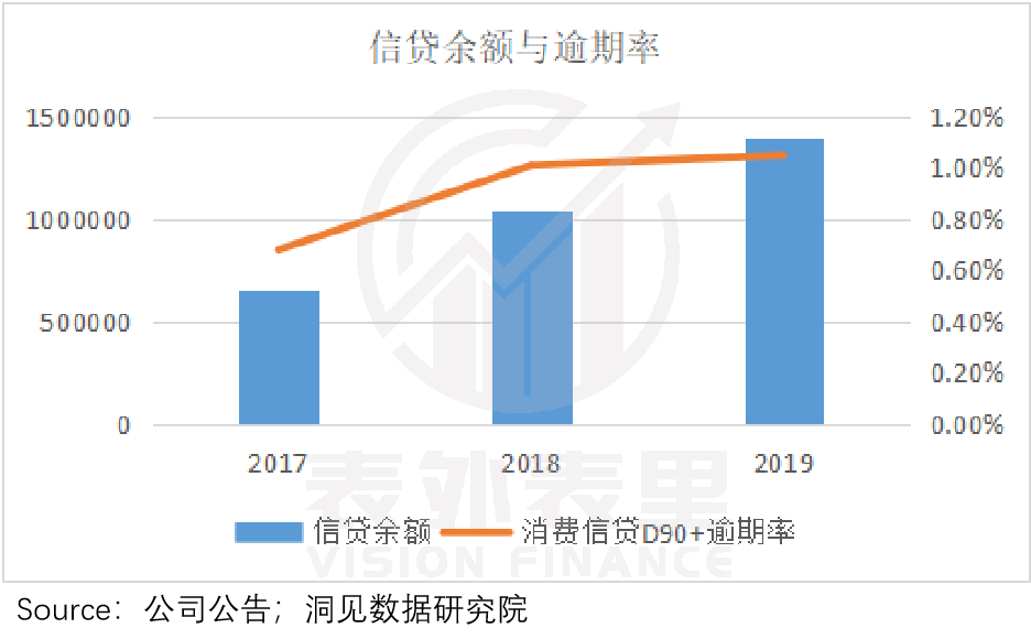 数据显示,从2017年到2019年,支付宝月活人数上涨了1.6亿人。但从2017年到2019年的90天以上消费信贷逾期率并未出现大幅上升,始终保持在1%左右。