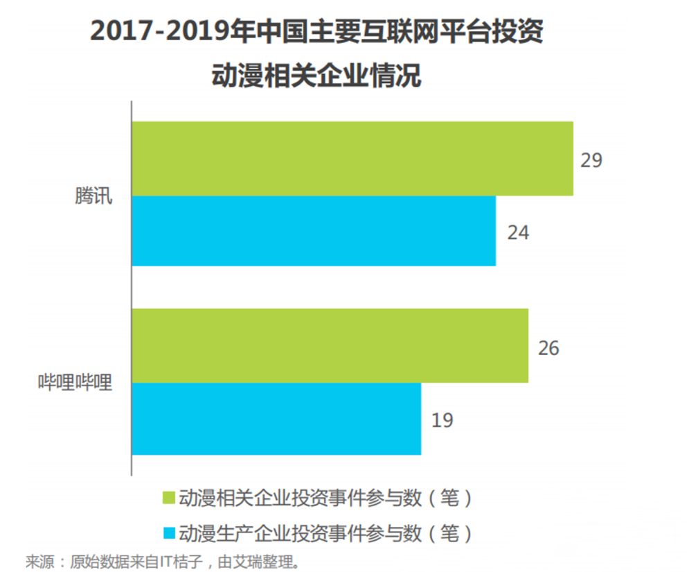 根据艾瑞报告显示,腾讯和哔哩哔哩在2017-2019年中,分别投资了53家和45家动漫相关企业。视频平台出品动漫公司制作、公司出品平台独播,或平台与公司联合出品,是最常见的合作模式。