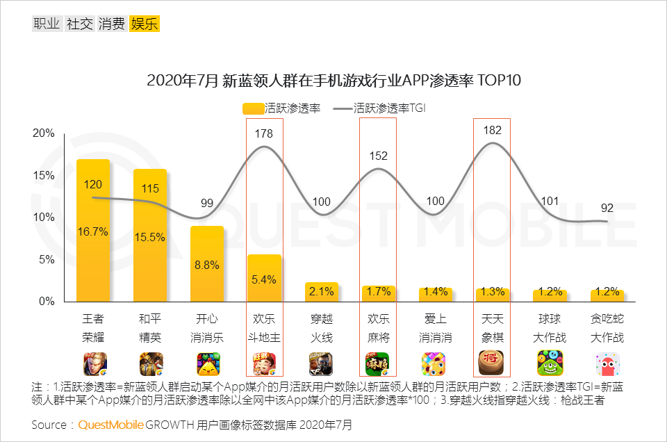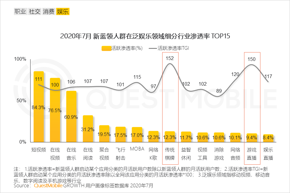 短视频、在线视频、在线音乐及在线阅读成为新蓝领人群在泛娱乐领域渗透率较高的四个行业;象棋、斗地主及麻将等传统棋牌手游类型深受该人群的喜爱