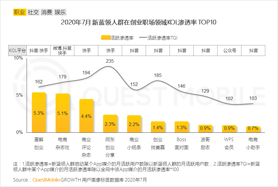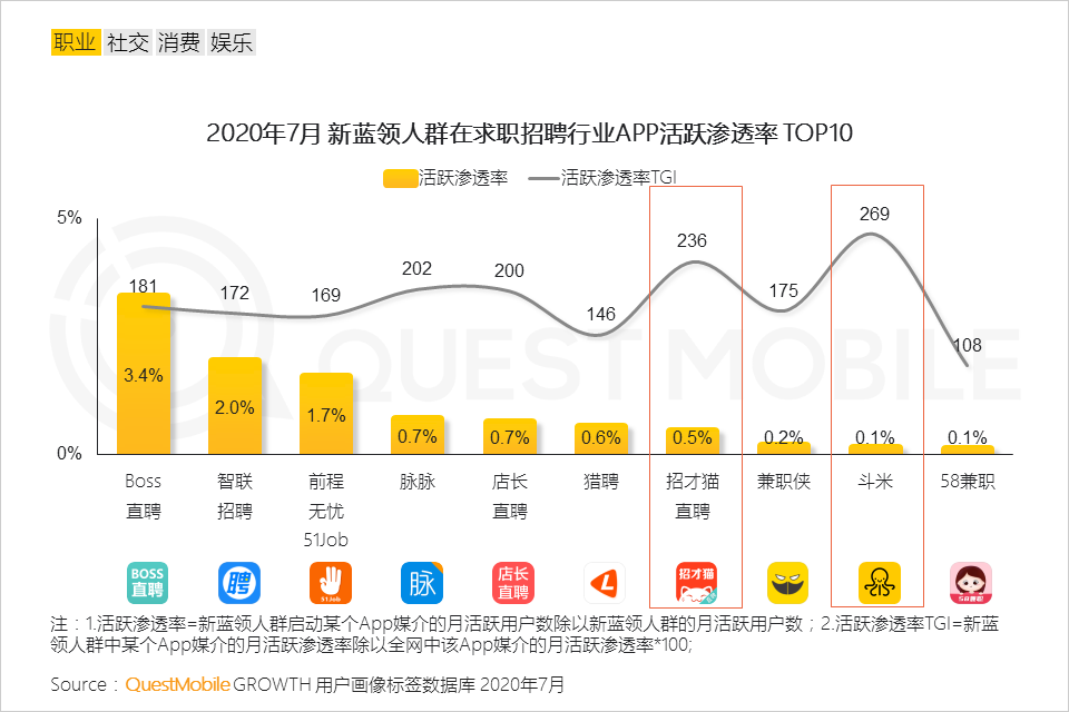 2.2 相比全网用户,新蓝领人群在求职招聘领域更加活跃;偏重城市服务业的招聘APP更贴合其人群职业特点,活跃渗透率TGI较为显著
