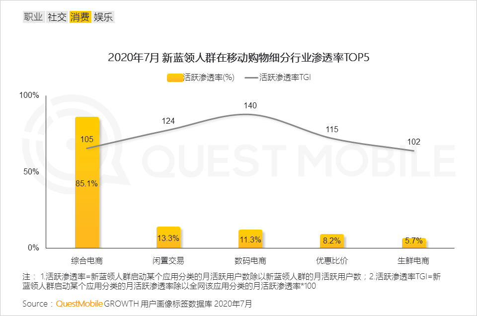 4.1 新蓝领用户网购更多使用综合电商平台,对数码电商及闲置交易类平台偏好明显
