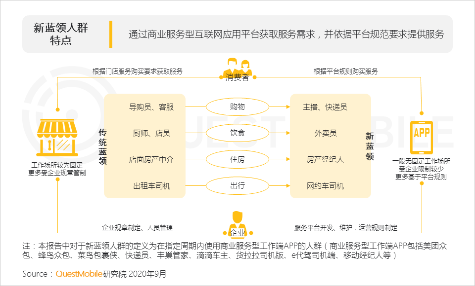 1、新蓝领人群通过互联网应用平台获取服务需求,也基于平台要求提供服务劳动,互联网应用平台取代传统企业管理成为新蓝领人群工作的依据