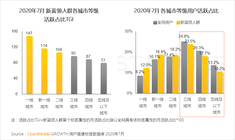 4、一二线城市市场需求巨大、机会更多,新蓝领人群活跃度更高;随着市场消费下沉,三线及以下城市新蓝领人群蕴含有巨大的职业增长潜力