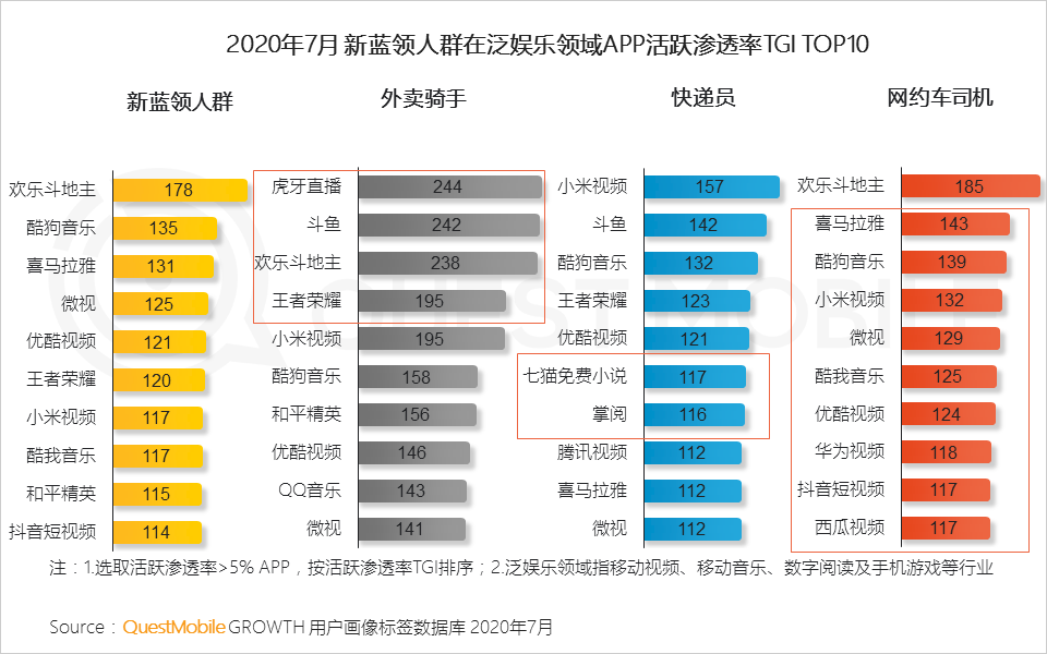 10、外卖骑手们热衷于游戏以及看游戏直播;快递员们的喜好则相对更加多元,除视频、音乐、游戏外,在线阅读类APP也是他们所爱;网约车司机们在泛娱乐领域的偏好集中在视频和音乐类APP