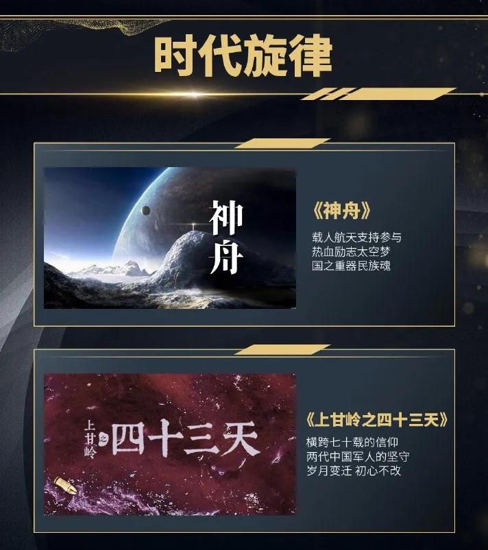 在新片单的时代旋律单元中,公布了《神舟》《上甘岭之四十三天》两部作品,将把中国航天的故事和著名的上甘岭战役搬上大银幕。