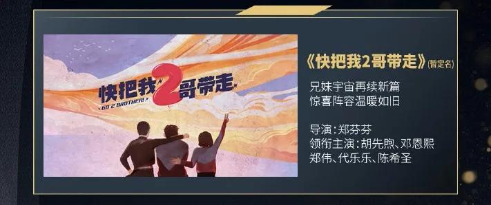 《快把我2哥带走》则是热门青春电影《快把我哥带走》的“兄妹宇宙”续作。前作导演郑芬芬将回归执导,而主演阵容中则集结了胡先煦、邓恩熙、郑伟、代乐乐、陈希圣等五位演员,目前该片已经完成拍摄。