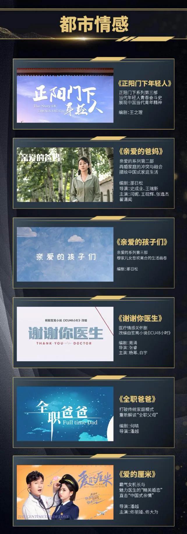 包括“正阳门下”系列第三部作品《正阳门下年轻人》,由杨幂、白宇主演的医疗题材剧集《谢谢你医生》,佟丽娅、佟大为主演的都市剧《爱的厘米》,以及《亲爱的爸妈》《亲爱的孩子们》《全职爸爸》三部聚焦家庭的作品。