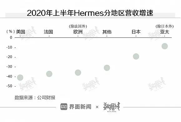 分地区来看,欧美市场最为惨淡。2020上半年,在美国地区,Hermes半年营收约3.4亿欧元,同比下降达40.83%,降幅远超其他地区。与之相比,除日本外的亚太地区半年营收达到11.8亿欧元,降幅仅为8.9%。