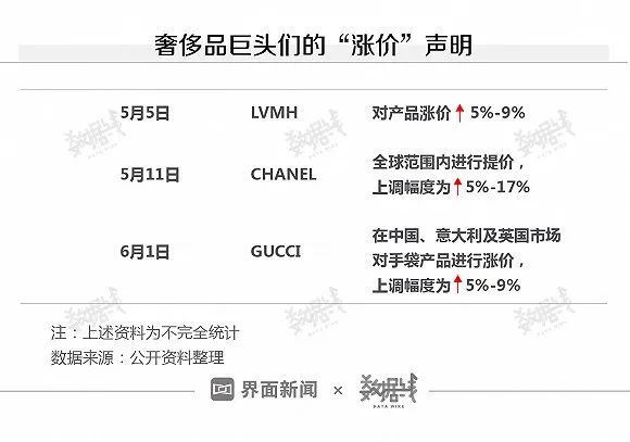 奢侈品行业整体承压,多家品牌逆势提价。据界面数据不完全统计,截至目前,今年以来,至少有LVMH、CHANEL以及GUCCI等奢侈品牌上调产品价格。其中,上调幅度最高达到17%。