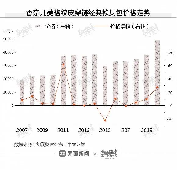 据中泰证券,以CHANEL一款经典款女包为例,2020年,这款女包的价格达到约4.89万元,同比去年涨了近30%,创下十三年来最大涨幅(2011年除外)。