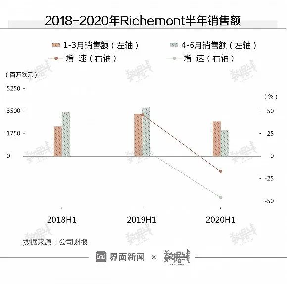在销售额方面,以瑞士奢侈品巨头Cartier母公司历峰集团(Richemont)为例,2020年上半年该集团销售额下降了约33.23%。其中,4-6月下降幅度达到46.71%。