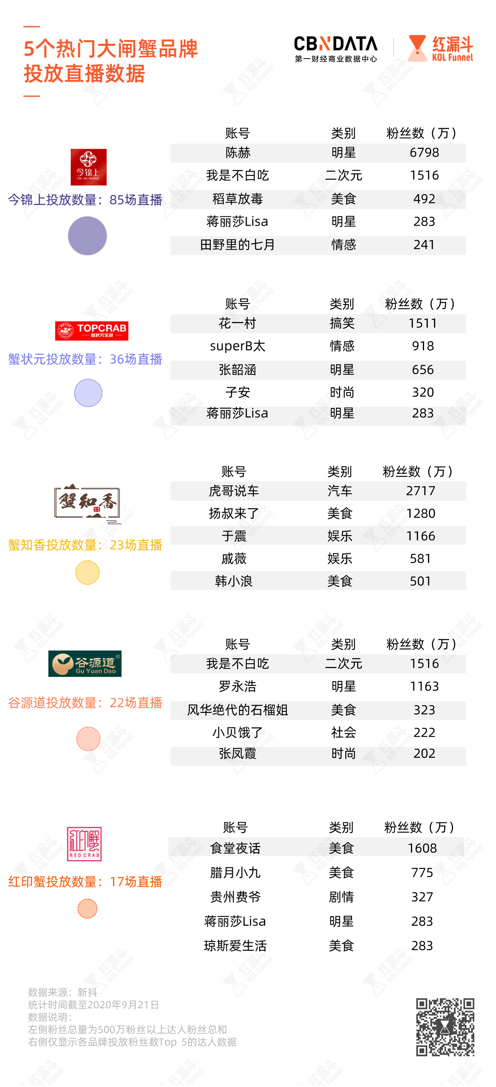 C站盘点发现,抖音直播间内热卖的蟹品牌相当集中。蟹知香、蟹状元、今锦上、谷源道、红印蟹是具有代表性的5个头部品牌。