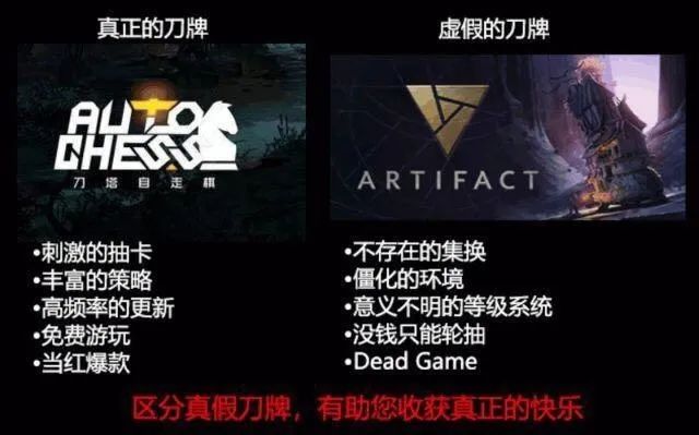 与此同时,一款类似麻将玩法的《刀塔自走棋》在《DOTA2》玩家游廊迅速窜红,V社被自家粉丝的自制游戏逼到了墙角。针对《刀塔自走棋》与《Artifact》玩家还造出了“真假刀牌”的梗,这无疑给早已立在悬崖边上的《Artifact》致命一击,从此沦为一个Dead Game。