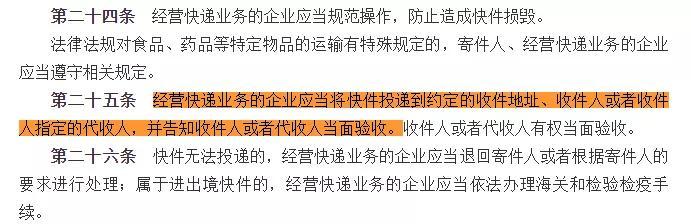 即使是免费代收,驿站距离用户家往往也有数分钟的路程,涉及大件包裹和高层住户时取件更加不便。不经过用户同意直接将快递放在代收点、快递柜合理吗?我国《快递暂行条例》中明确指出,经营快递业务的企业应当将快件投递到约定的收件地址、收件人或者收件人指定的代收人,并告知收件人或者代收人当面验收。