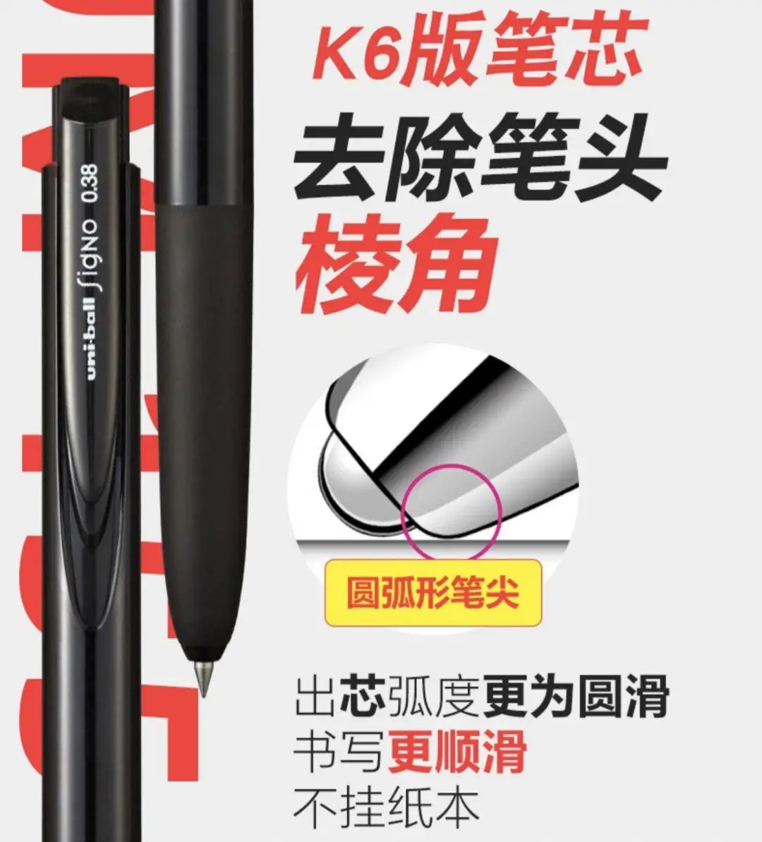 在三菱K6型中性笔关于不刮纸的描述中,提到圆弧形笔尖,去除棱角,所以不挂纸。注意是不挂纸,而非不易挂纸。没有修饰词,透露出三菱对技术的自信。