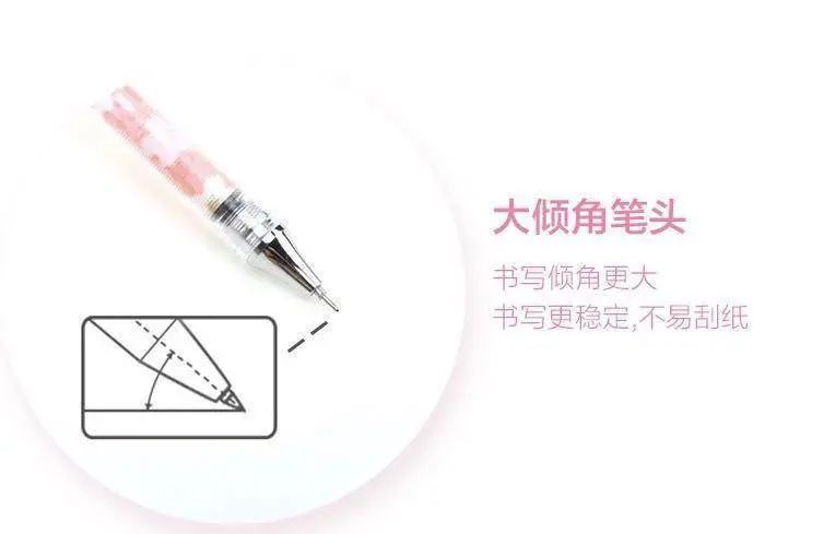 樱花季限定款产品,提到了产品使用性能的痛点——刮纸。晨光给出的依据是大倾角笔头,不易刮纸。