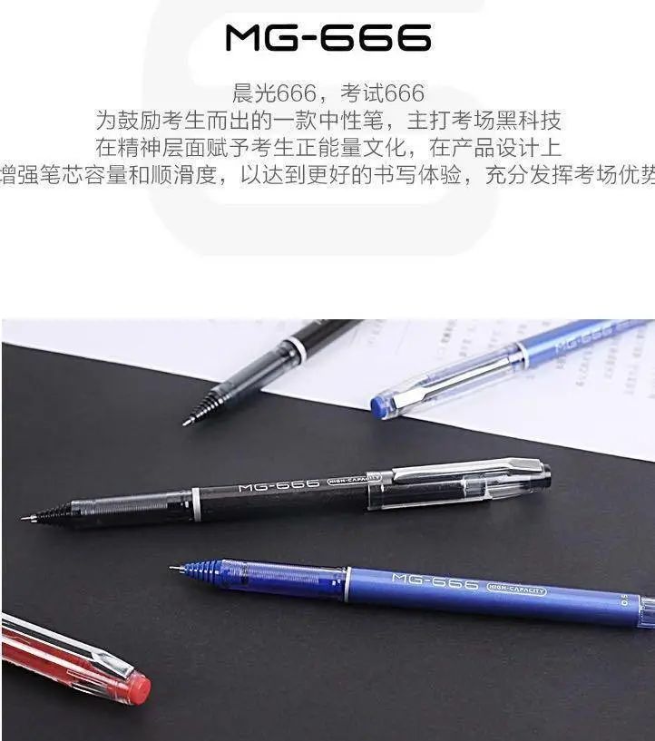 晨光的另一款产品MG666,同样主打考试用笔,在产品描述中直白的写到“在精神层面赋予考生正能量文化”。