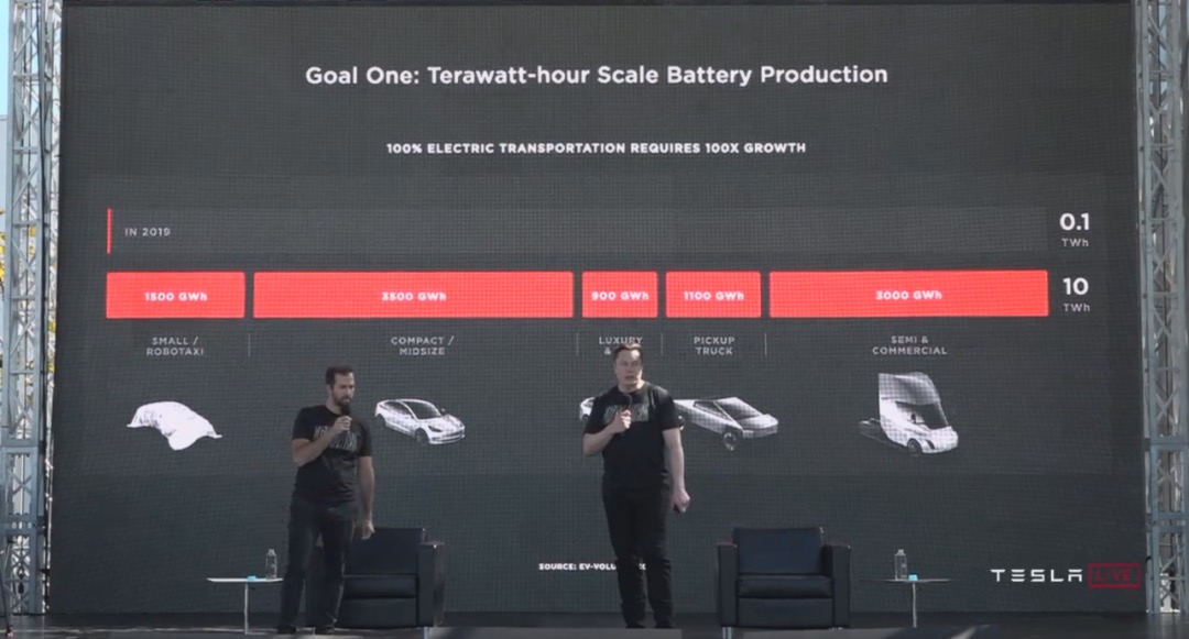 马斯克表示:特斯拉想要真正实现100%纯电交通,电池的生产能力还需要以如今的100倍速度成长,起码需要10TWh的生产总量。